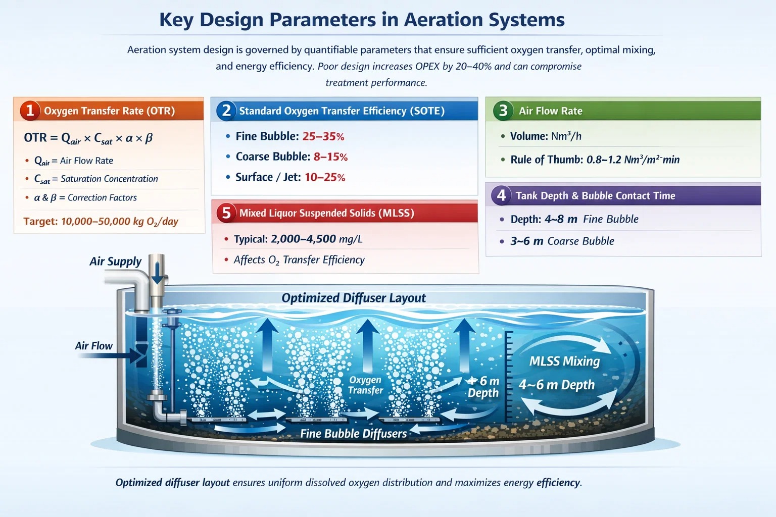 Zuurstofoverdracht: Fijne bubbelverspreiders achieve 25–35% SOTE; oxygen demand must match biological load.